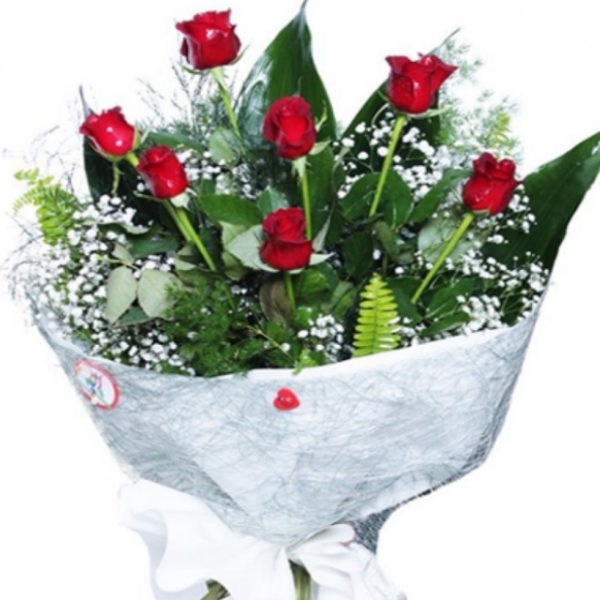 Ürün Kodu: DS11560 cm Yükseklik 30 cm çapında 7 Adet Kırmızı Gül Yeşillik ve cipso Ürün Detayları; 7 adet kırmızı gülden oluşan Cipsofilyalar eşliğinde etrafı elyaf malzeme ile çevrilmiş şahane bir gül buketi.