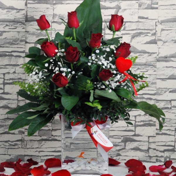 Ürün Kodu: DS69Cam Vazo İçerisinde Balıklı Ve 9 Adet Kırmızı Gülden Oluşan Sevgilye Hediye Edilebilecek Zarif Bir Çiçek Aranjmanıdır.