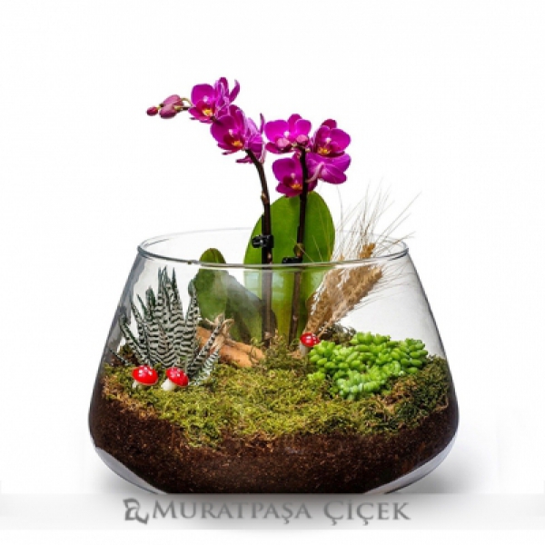 Ürün Kodu: DS245cam fanus Özel teraryum camı içerisinde sukulent ve çift dallı mini mor orkideden oluşan özel tasarım teraryum.