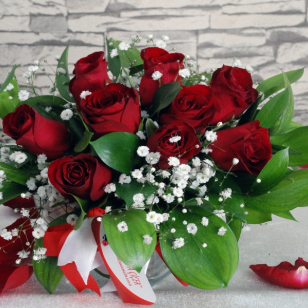 Ürün Kodu: DS1339 Adet Kırmızı Gül Cipso ve Yeşillikler Dekoratif Taşlar Cam Kalp Vazo