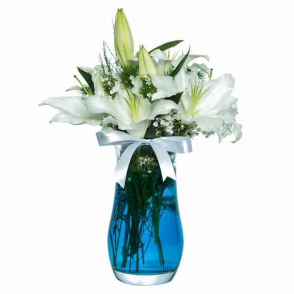 Ürün Kodu: DS109Zarif vazoda özel tasarım mavi suyun içinde 6 adet kokulu beyaz lilyum. Lilyum; zarafet ve güven duygusunu simgeler. Mavi suların içinden size aşkı anlatan beyaz lilyum çiçeklerinin zarafeti, sevginizi en güzel biçimde sevdiklerinize gösterecek.