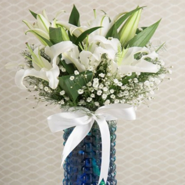 Ürün Kodu: DS58Yaklaşık Ürün Boyutu: 35 cm Zarif vazoda özel tasarım mavi suyun içinde 3 adet kokulu beyaz lilyum. Lilyum; zarafet ve güven duygusunu simgeler. Mavi suların içinden size aşkı anlatan beyaz lilyum çiçeklerinin zarafeti, sevginizi en güzel biçimde sevdiklerinize gösterecek.Not: Lilyumlar, mevsimsel şartlar nedeniyle kapalı olarak gönderilebilir. Kapalı lilyumlar oda sıcaklığında ve 1-2 gün içerisinde açmaktadır.