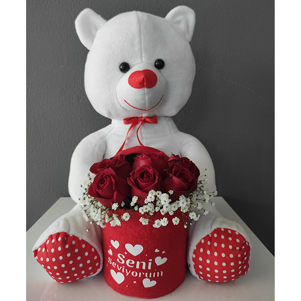 Ürün Kodu: DS302Peluş ayıcık kucağında 9 adet kırmızı gülden oluşan peluş ayıcık aranjmanı