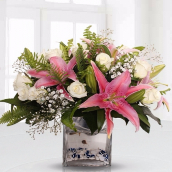 Ürün Kodu: DS10611 Adet Beyaz Gül 3 Dal Pembe Kazablanka Cipso ve Yeşillikler 2 Adet Japon Balığı Dekoratif Taşlar Karre Mika Vazo