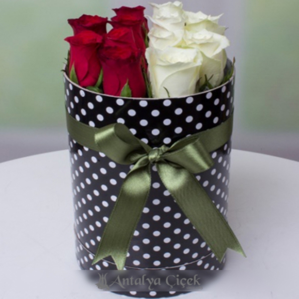 Ürün Kodu: DS129Özel kaplamalı puantiyeli kutu içerisinde 4 adet beyaz gül ve 5 adet kırmızı gülden oluşan aranjman.