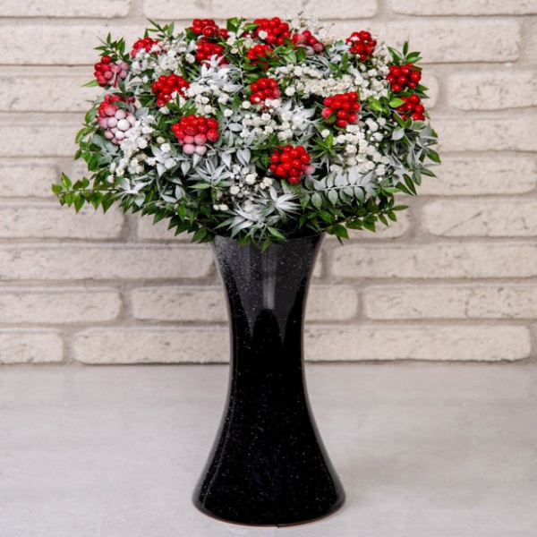 Ürün Kodu: DS269Kokina siyah Cam vazoda 18 Adet çiçelkli Arajman yılbaşı çiçeği